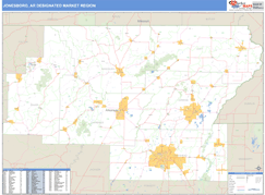 The Basic Style Jonesboro Designated Market Region (DMR), AR Digital Map map is great for presentation, offering colored shading of major populated areas. It is an excellent choice for applications that benefit from a professional look and basic map reference information.