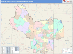 The Color Cast Style Idaho Falls-Pocatello Designated Market Region (DMR), ID Digital Map boasts a multi-colored display that shades each ZIP Code area with its own background color. It is an ideal choice for applications that benefit from quickly and easily distinguishing one ZIP Code from the others.