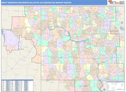 The Color Cast Style Minot-Bismarck-Dickinson (Williston) Designated Market Region (DMR), ND Digital Map boasts a multi-colored display that shades each ZIP Code area with its own background color. It is an ideal choice for applications that benefit from quickly and easily distinguishing one ZIP Code from the others.