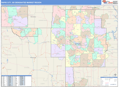The Color Cast Style Rapid City Designated Market Region (DMR), SD Digital Map boasts a multi-colored display that shades each ZIP Code area with its own background color. It is an ideal choice for applications that benefit from quickly and easily distinguishing one ZIP Code from the others.