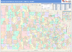 The Color Cast Style Wichita-Hutchinson Plus Designated Market Region (DMR), KS Digital Map boasts a multi-colored display that shades each ZIP Code area with its own background color. It is an ideal choice for applications that benefit from quickly and easily distinguishing one ZIP Code from the others.